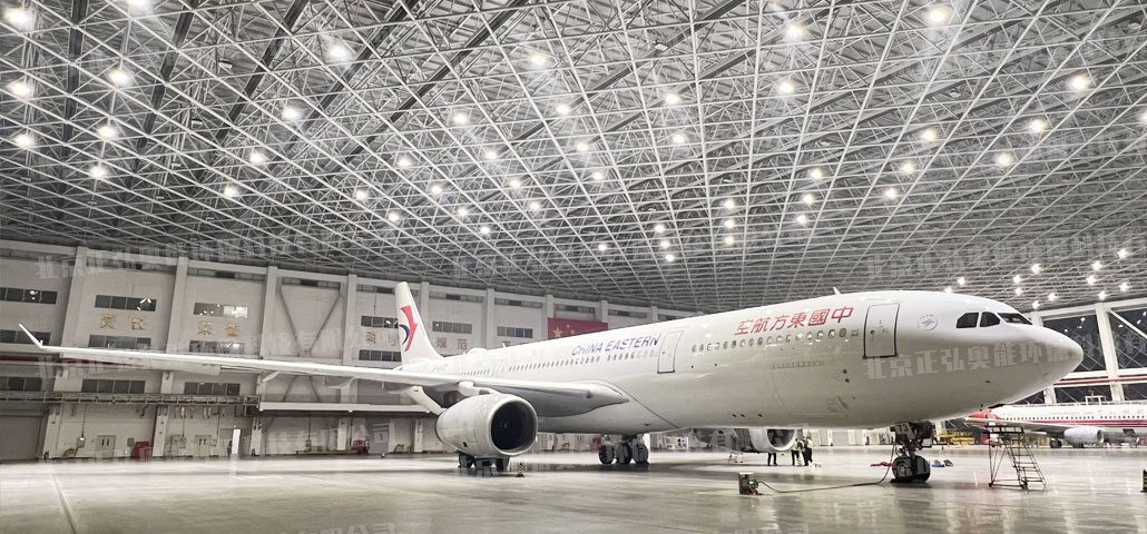 項目名稱:中國東方航空公司大興新機場機庫項目 項目地點:北京市大興區 項目概況:北京大興國際機場東航基地機務維修及特種車輛維修區一期工程,總建筑面積8.54萬平方米,包括機庫及附樓、業務樓、航材庫、北區能源動力中心等15棟單體建筑。其中北區機庫總建筑面積2.8萬平方米,是東航基地內規模較大的單體工程。機庫由一個維修機庫大廳和四層附樓組成,共設有2個寬體機機位或3個窄體機機位,多可同時容納2架波音747或3架波音777型機,能夠滿足多型號、不同維修維護需求的飛機靈活停放。